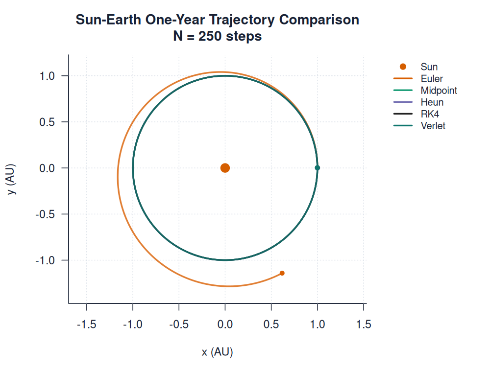 | sun_earth_all_methods.pngimages/comparisons/sun_earth_all_methods.png | method_comparison_orbit | 250 | Sun-Earth One-Year Trajectory Comparison | N = 250 steps | ||