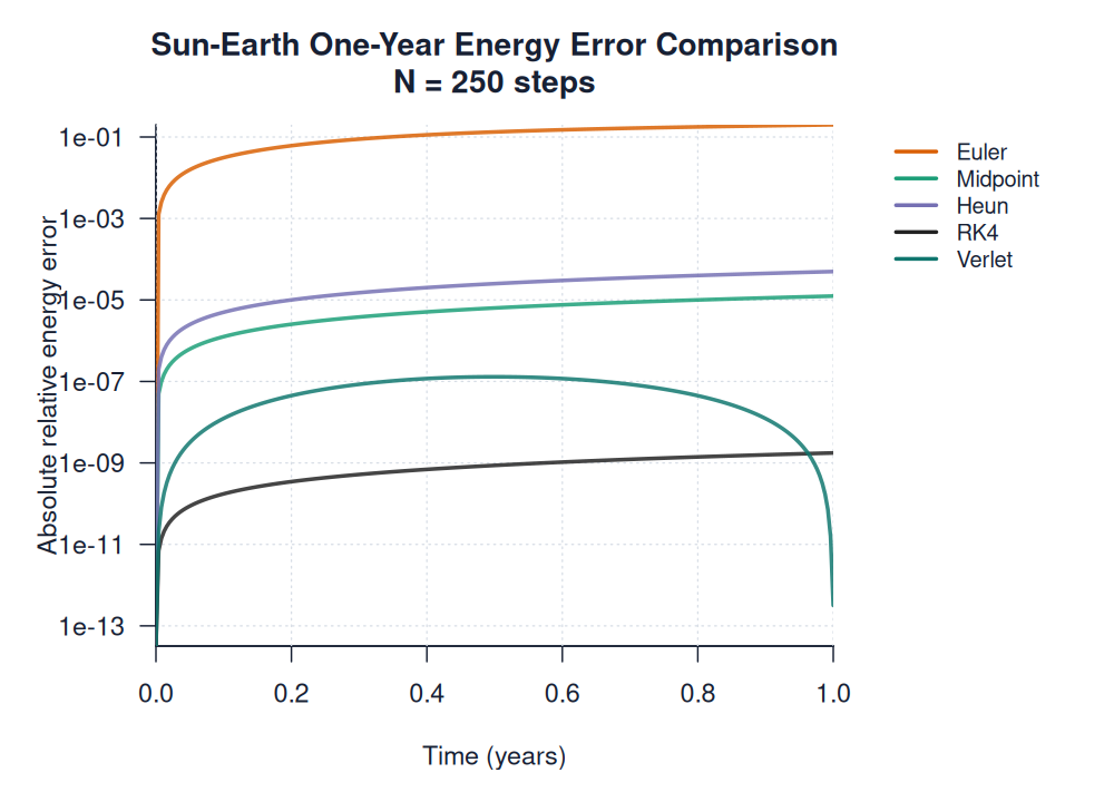 | sun_earth_energy_error_all_methods.pngimages/comparisons/sun_earth_energy_error_all_methods.png | method_comparison_diagnostic | 250 | Sun-Earth One-Year Energy Error Comparison | N = 250 steps | ||
