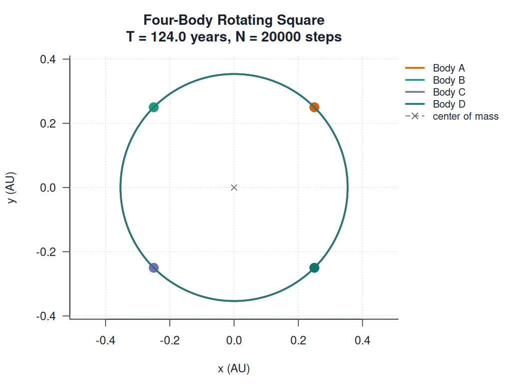 | rotating_square_four_body.htmlimages/n_body/special_solutions/rotating_square_four_body.html | trajectory_animation | 900 | Four-Body Rotating Square | T = 124.0 years, N = 20000 steps | ||