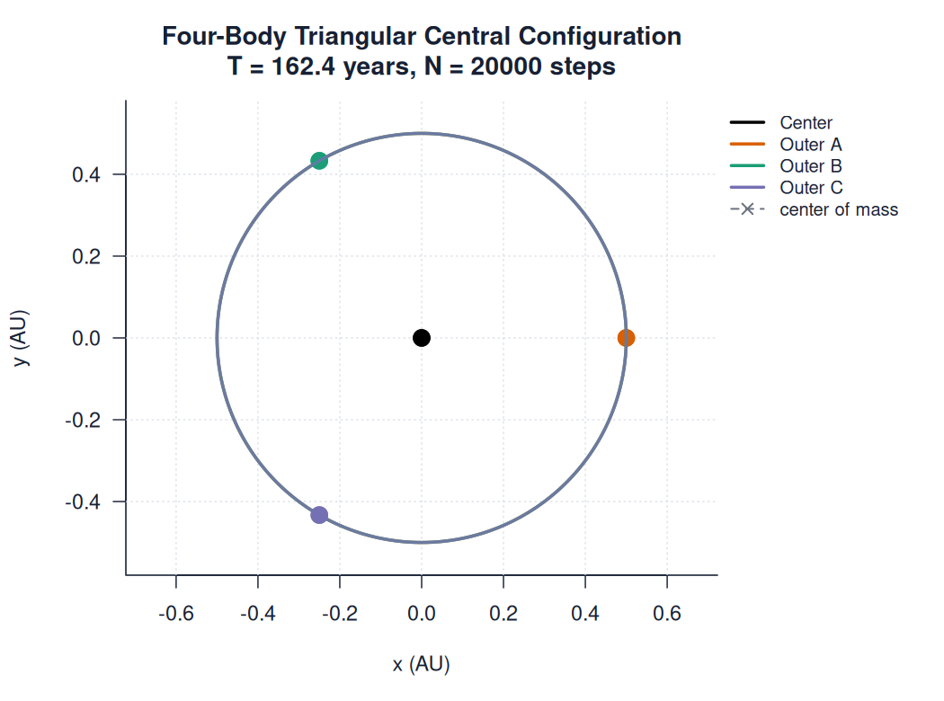 | triangular_central_four_body.htmlimages/n_body/special_solutions/triangular_central_four_body.html | trajectory_animation | 900 | Four-Body Triangular Central Configuration | T = 162.4 years, N = 20000 steps | ||