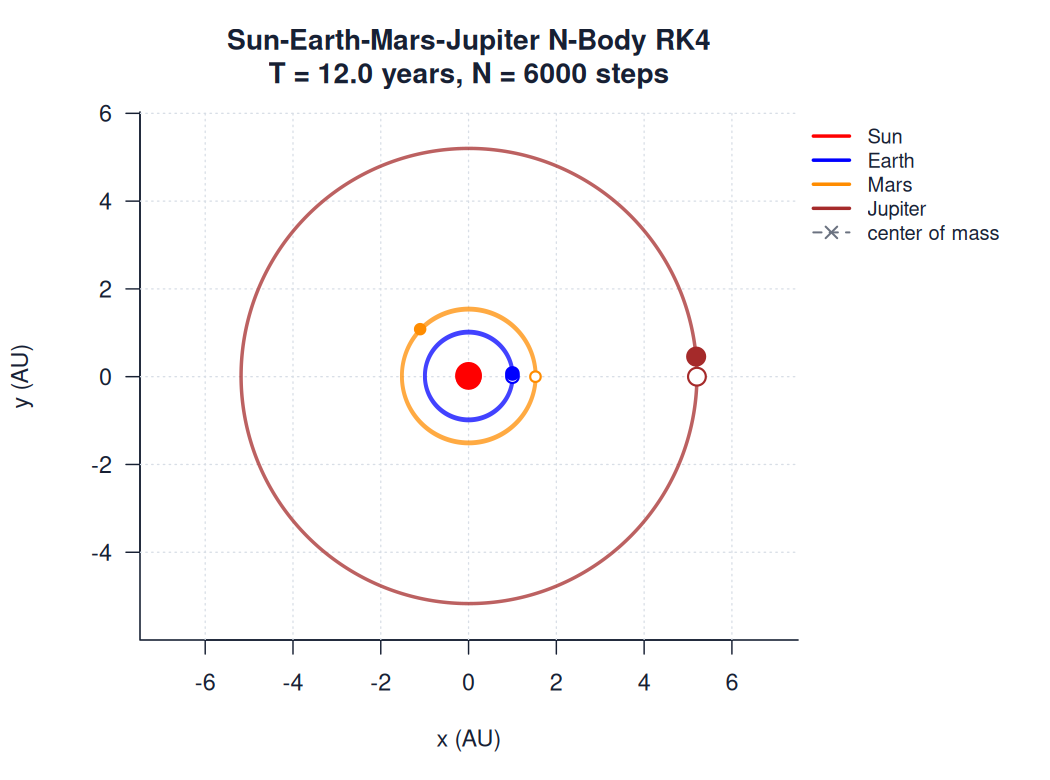 | sun_earth_mars_jupiter.htmlimages/n_body/sun_earth_mars_jupiter.html | trajectory_animation | RK4 | 900 | Sun-Earth-Mars-Jupiter N-Body RK4 | T = 12.0 years, N = 6000 steps | |