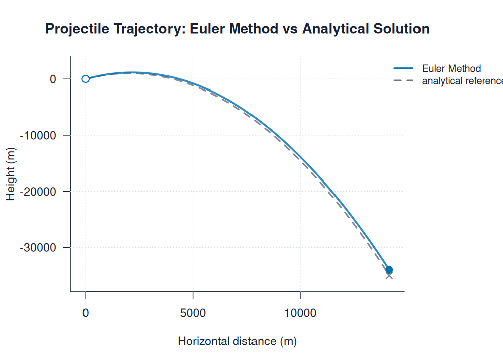 | euler_trajectory.pngimages/projectile/euler_trajectory.png | projectile | Euler Method | Projectile Trajectory: Euler Method vs Analytical Solution | ||