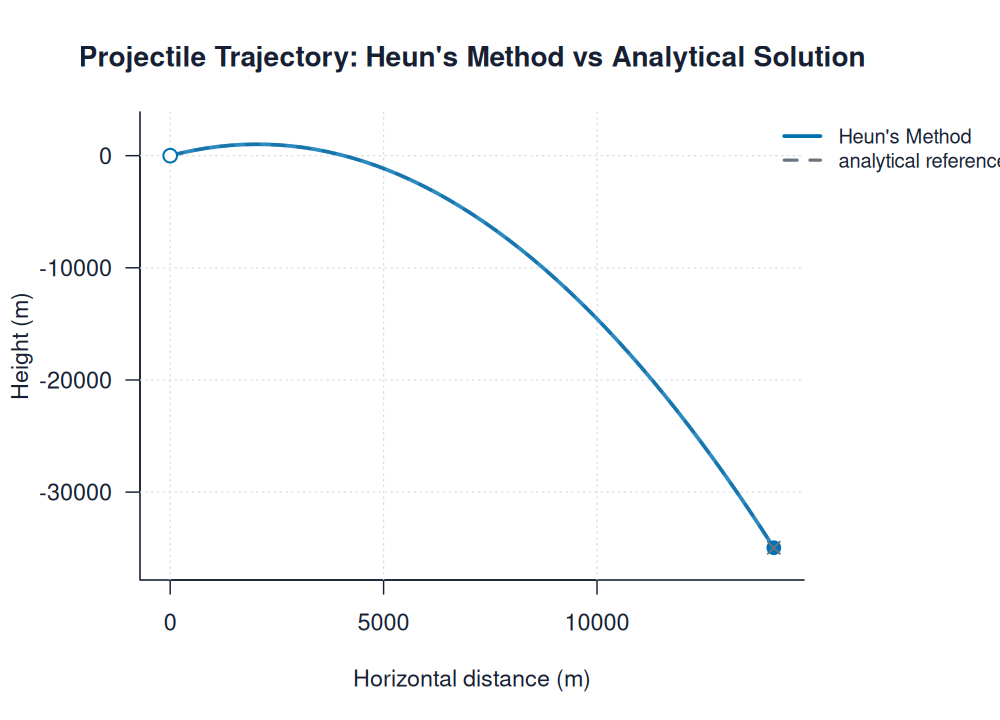 | heun_trajectory.pngimages/projectile/heun_trajectory.png | projectile | Heun's Method | Projectile Trajectory: Heun's Method vs Analytical Solution | ||
