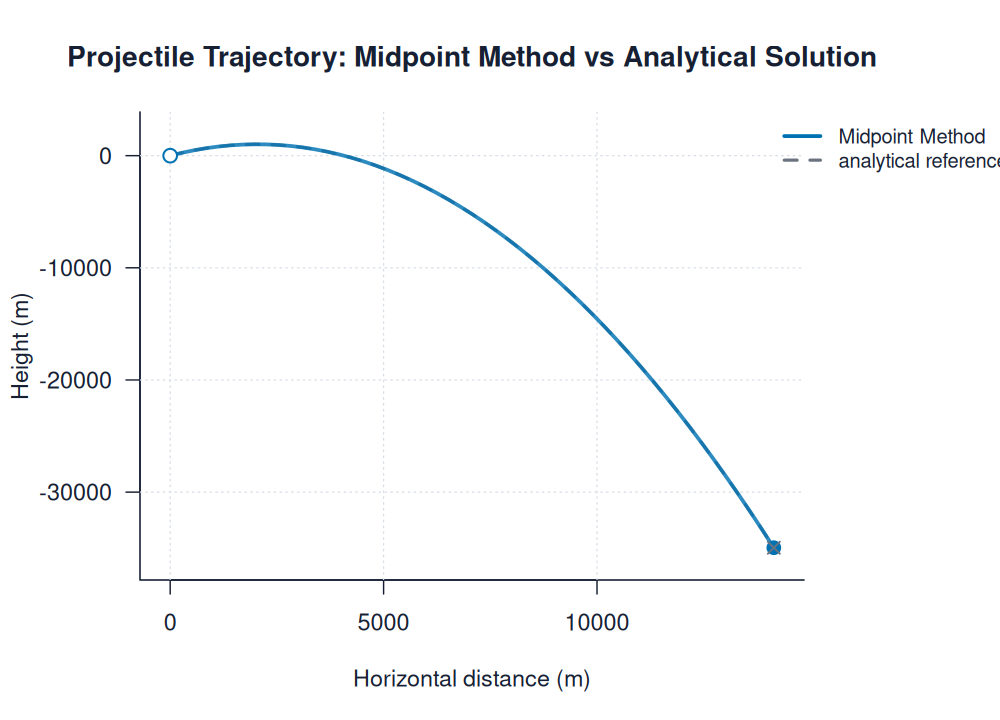 | midpoint_trajectory.pngimages/projectile/midpoint_trajectory.png | projectile | Midpoint Method | Projectile Trajectory: Midpoint Method vs Analytical Solution | ||