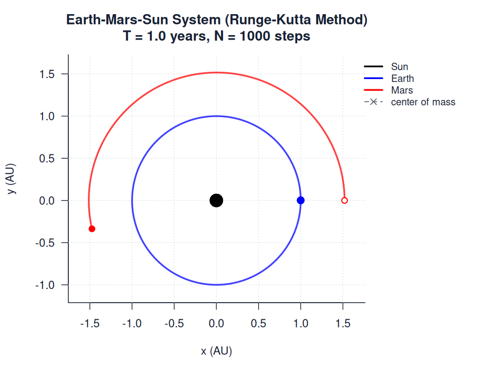 | earth_mars_sun.htmlimages/three_body/general/earth_mars_sun.html | trajectory_animation | Runge-Kutta Method | 900 | Earth-Mars-Sun System (Runge-Kutta Method) | T = 1.0 years, N = 1000 steps | |