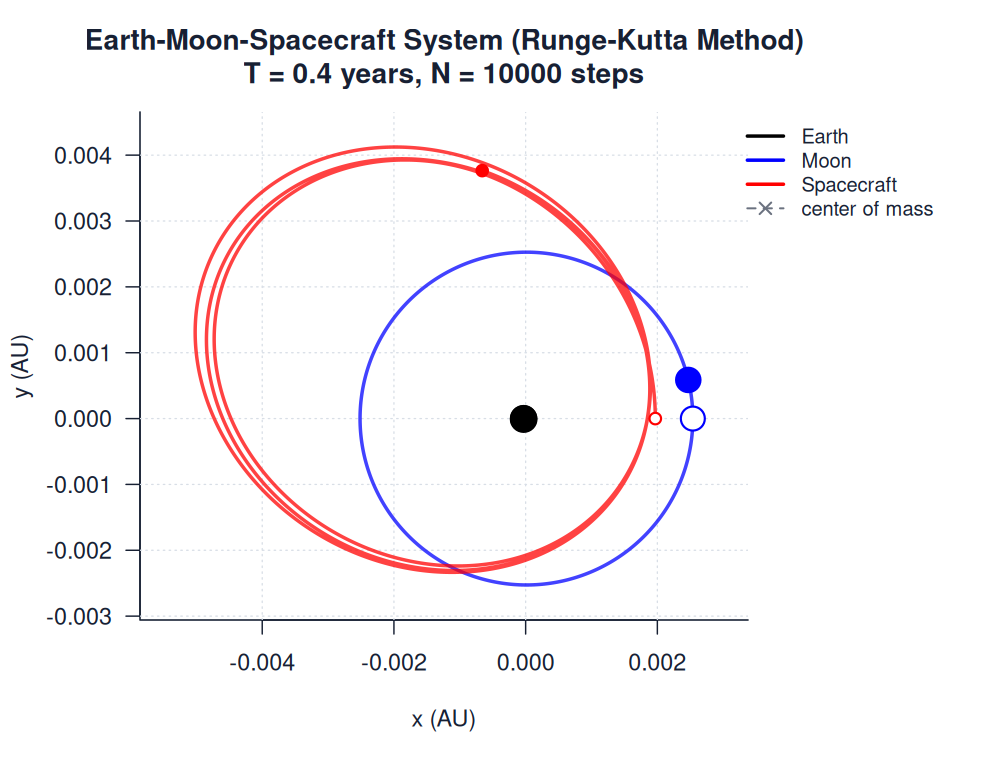 | earth_moon_spacecraft.htmlimages/three_body/general/earth_moon_spacecraft.html | trajectory_animation | Runge-Kutta Method | 900 | Earth-Moon-Spacecraft System (Runge-Kutta Method) | T = 0.4 years, N = 10000 steps | |