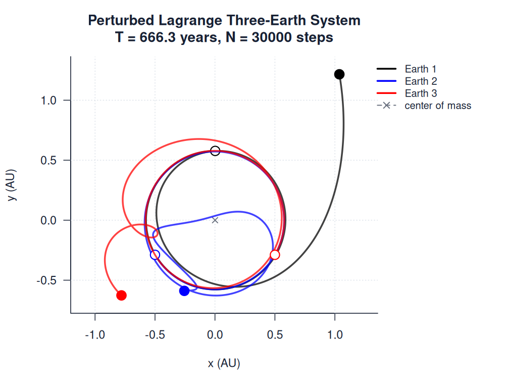 | perturbed_lagrange_three_earths.pngimages/three_body/perturbations/perturbed_lagrange_three_earths.png | three_body_orbit | 30000 | 1.0000003 | Perturbed Lagrange Three-Earth System | T = 666.3 years, N = 30000 steps | |