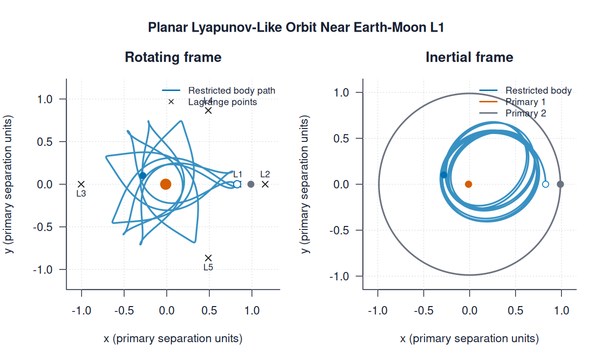 | lyapunov_near_l1.pngimages/three_body/restricted/lyapunov_near_l1.png | restricted_three_body | Planar Lyapunov-Like Orbit Near Earth-Moon L1 | |||