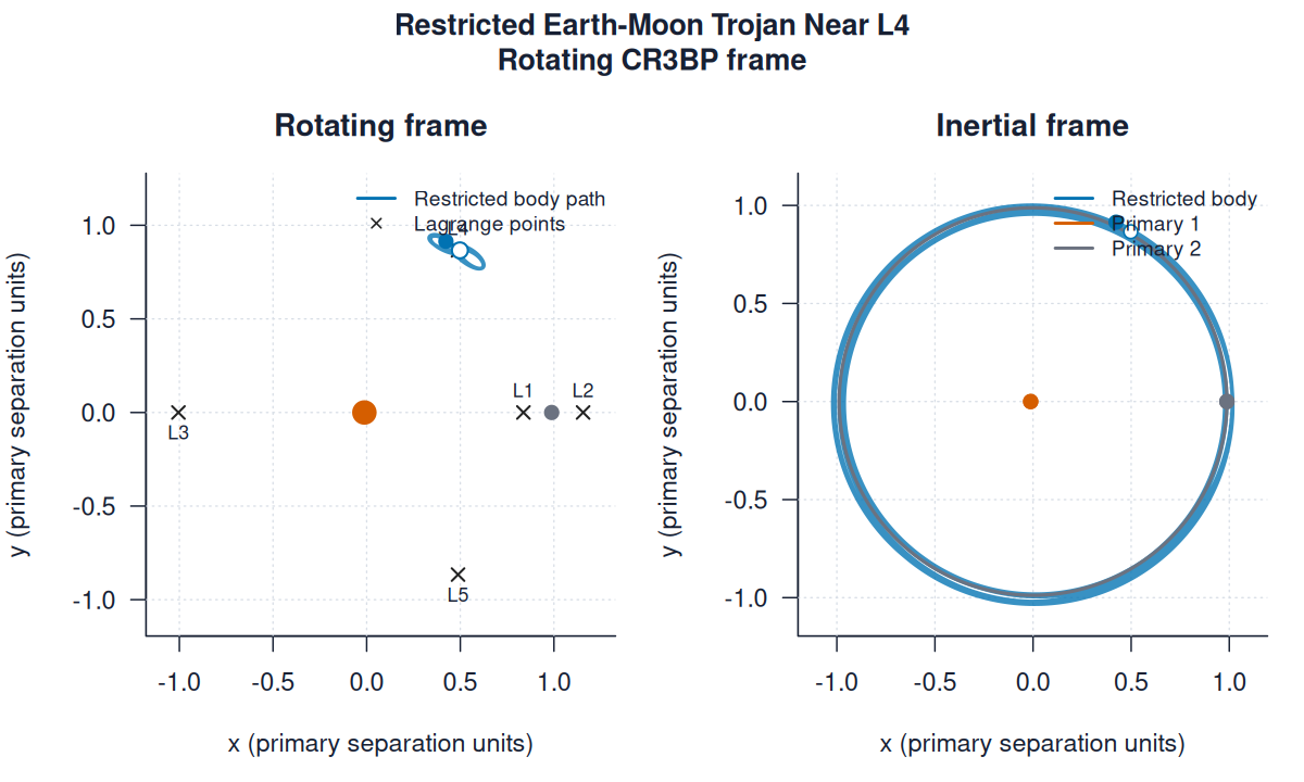 | restricted_earth_moon_trojan.pngimages/three_body/restricted/restricted_earth_moon_trojan.png | restricted_three_body | Restricted Earth-Moon Trojan Near L4 | Rotating CR3BP frame | |||