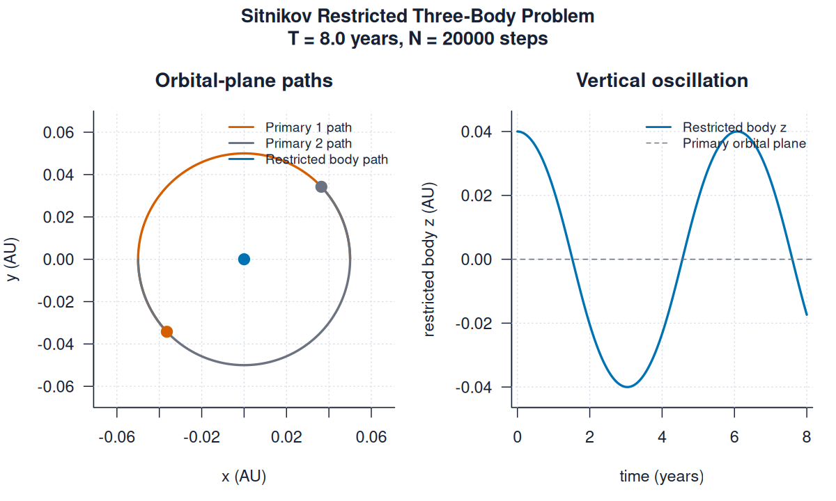 | sitnikov_three_body.pngimages/three_body/restricted/sitnikov_three_body.png | sitnikov | 20000 | Sitnikov Restricted Three-Body Problem | T = 8.0 years, N = 20000 steps | ||