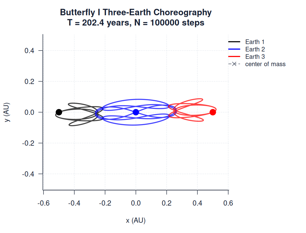 | butterfly_choreography.htmlimages/three_body/special_solutions/butterfly_choreography.html | trajectory_animation | 900 | Butterfly I Three-Earth Choreography | T = 202.4 years, N = 100000 steps | ||