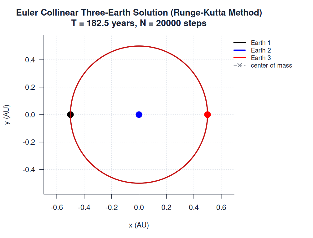 | euler_collinear_three_earths.htmlimages/three_body/special_solutions/euler_collinear_three_earths.html | trajectory_animation | Runge-Kutta Method | 900 | Euler Collinear Three-Earth Solution (Runge-Kutta Method) | T = 182.5 years, N = 20000 steps | |