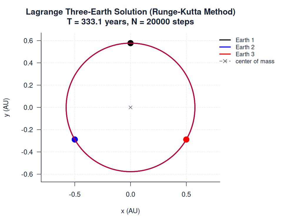 | lagrange_three_earths.htmlimages/three_body/special_solutions/lagrange_three_earths.html | trajectory_animation | Runge-Kutta Method | 900 | Lagrange Three-Earth Solution (Runge-Kutta Method) | T = 333.1 years, N = 20000 steps | |