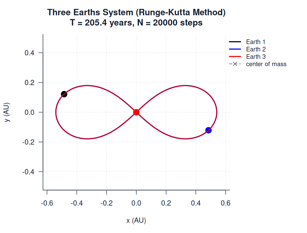 | three_earths.htmlimages/three_body/special_solutions/three_earths.html | trajectory_animation | Runge-Kutta Method | 900 | Three Earths System (Runge-Kutta Method) | T = 205.4 years, N = 20000 steps | |