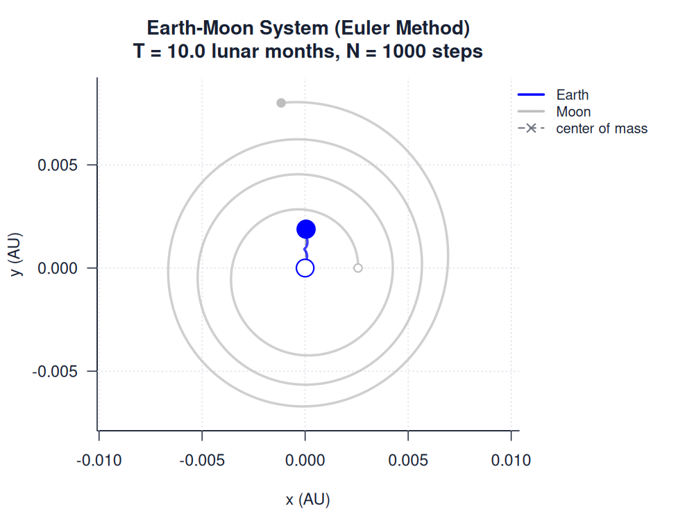 | earth_moon_euler.htmlimages/two_body/earth_moon/earth_moon_euler.html | trajectory_animation | Euler Method | 900 | Earth-Moon System (Euler Method) | T = 10.0 lunar months, N = 1000 steps | |