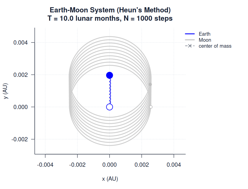 | earth_moon_heuns.htmlimages/two_body/earth_moon/earth_moon_heuns.html | trajectory_animation | Heun's Method | 900 | Earth-Moon System (Heun's Method) | T = 10.0 lunar months, N = 1000 steps | |