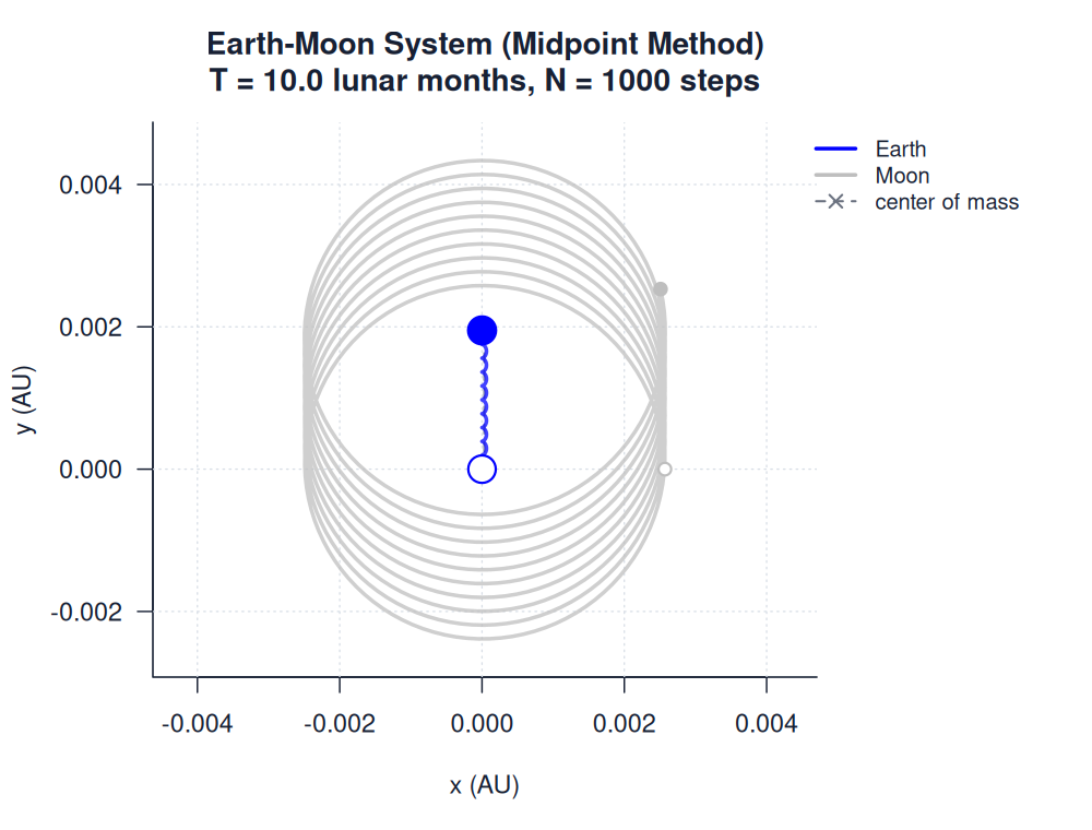 | earth_moon_midpoint.htmlimages/two_body/earth_moon/earth_moon_midpoint.html | trajectory_animation | Midpoint Method | 900 | Earth-Moon System (Midpoint Method) | T = 10.0 lunar months, N = 1000 steps | |