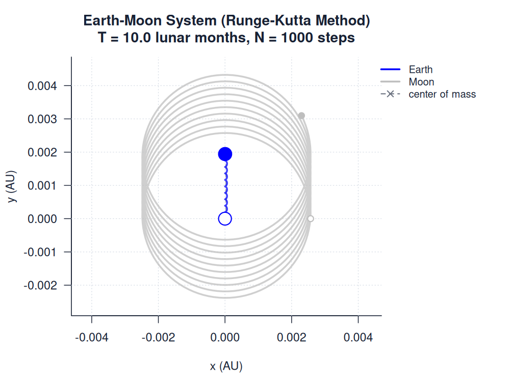 | earth_moon_runge_kutta.htmlimages/two_body/earth_moon/earth_moon_runge_kutta.html | trajectory_animation | Runge-Kutta Method | 900 | Earth-Moon System (Runge-Kutta Method) | T = 10.0 lunar months, N = 1000 steps | |