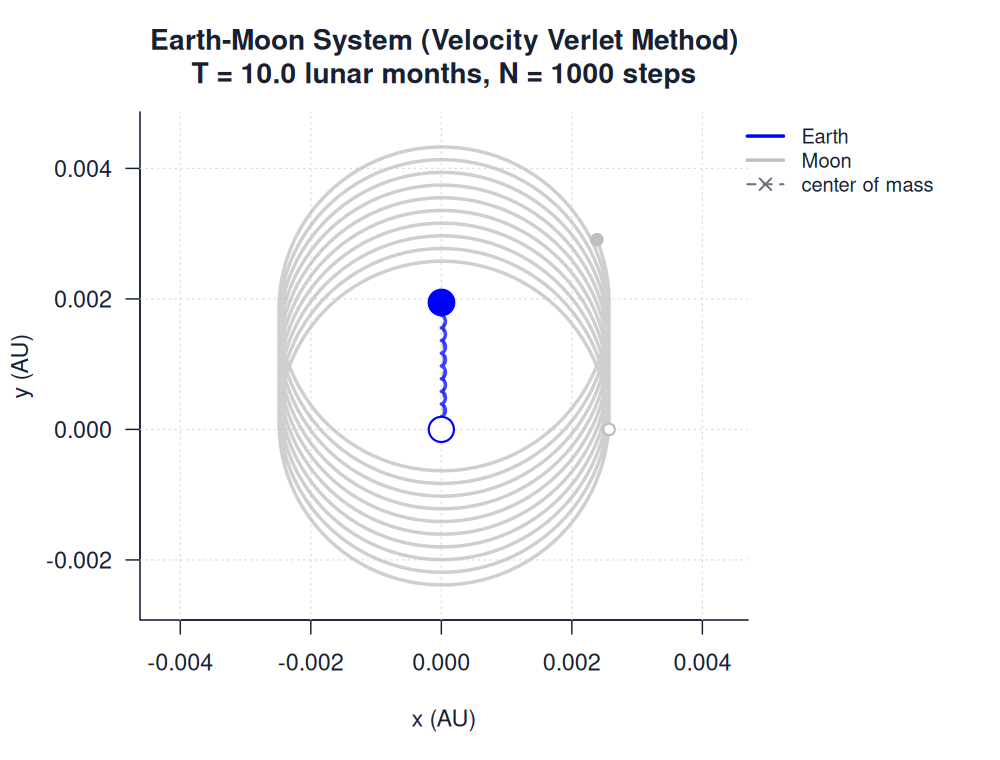 | earth_moon_velocity_verlet.htmlimages/two_body/earth_moon/earth_moon_velocity_verlet.html | trajectory_animation | Velocity Verlet Method | 900 | Earth-Moon System (Velocity Verlet Method) | T = 10.0 lunar months, N = 1000 steps | |