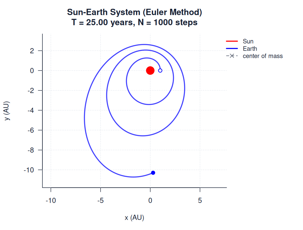 | sun_earth_euler.htmlimages/two_body/sun_earth/sun_earth_euler.html | trajectory_animation | Euler Method | 900 | Sun-Earth System (Euler Method) | T = 25.00 years, N = 1000 steps | |
