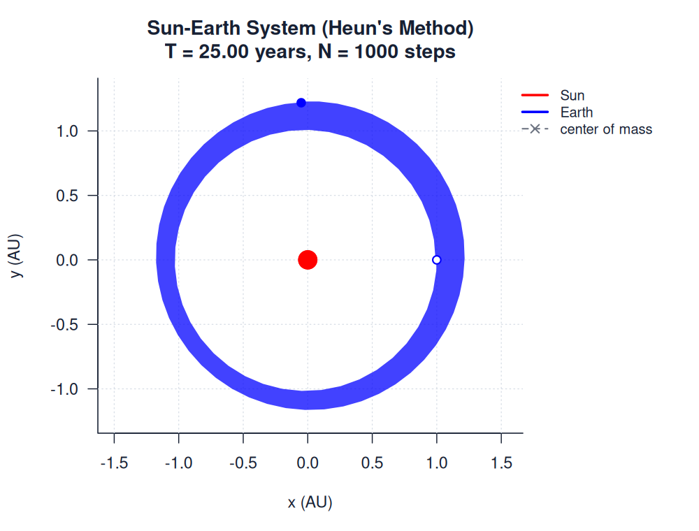 | sun_earth_heuns.htmlimages/two_body/sun_earth/sun_earth_heuns.html | trajectory_animation | Heun's Method | 900 | Sun-Earth System (Heun's Method) | T = 25.00 years, N = 1000 steps | |
