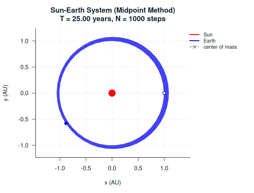 | sun_earth_midpoint.htmlimages/two_body/sun_earth/sun_earth_midpoint.html | trajectory_animation | Midpoint Method | 900 | Sun-Earth System (Midpoint Method) | T = 25.00 years, N = 1000 steps | |