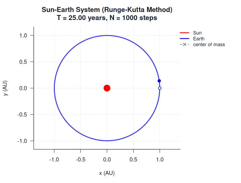 | sun_earth_runge_kutta.htmlimages/two_body/sun_earth/sun_earth_runge_kutta.html | trajectory_animation | Runge-Kutta Method | 900 | Sun-Earth System (Runge-Kutta Method) | T = 25.00 years, N = 1000 steps | |