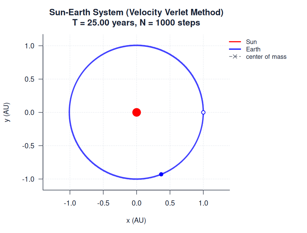 | sun_earth_velocity_verlet.htmlimages/two_body/sun_earth/sun_earth_velocity_verlet.html | trajectory_animation | Velocity Verlet Method | 900 | Sun-Earth System (Velocity Verlet Method) | T = 25.00 years, N = 1000 steps | |